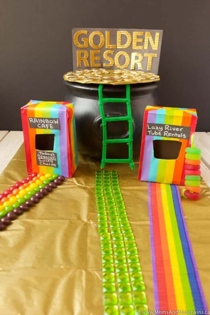 The “Golden Resort” – Create your own luxury getaway for leprechauns! With a rainbow café, tube rentals, and promises of good luck, this setup is any leprechaun’s dream destination. Add some chocolate coins around the entrance, and watch those mischievous leprechauns come running!