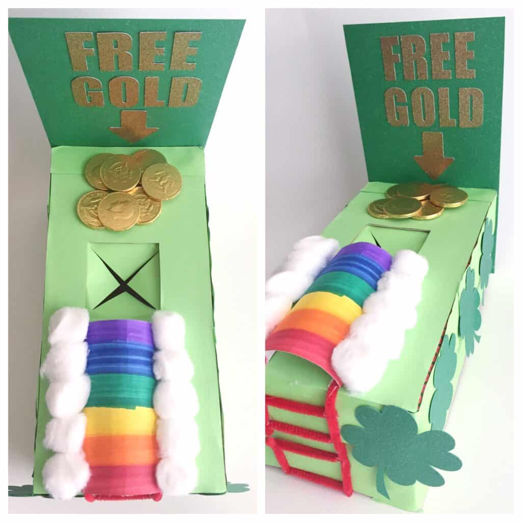 You don’t need fancy materials. Check your recycling bin for a cardboard box or tissue box that can become the base. Add construction paper, tissue paper for a pipe-cleaner rainbow, and cotton ball clouds. Set up your trap in plain sight with a little sign offering “free gold” as bait, and wait for that tricky leprechaun to show up!